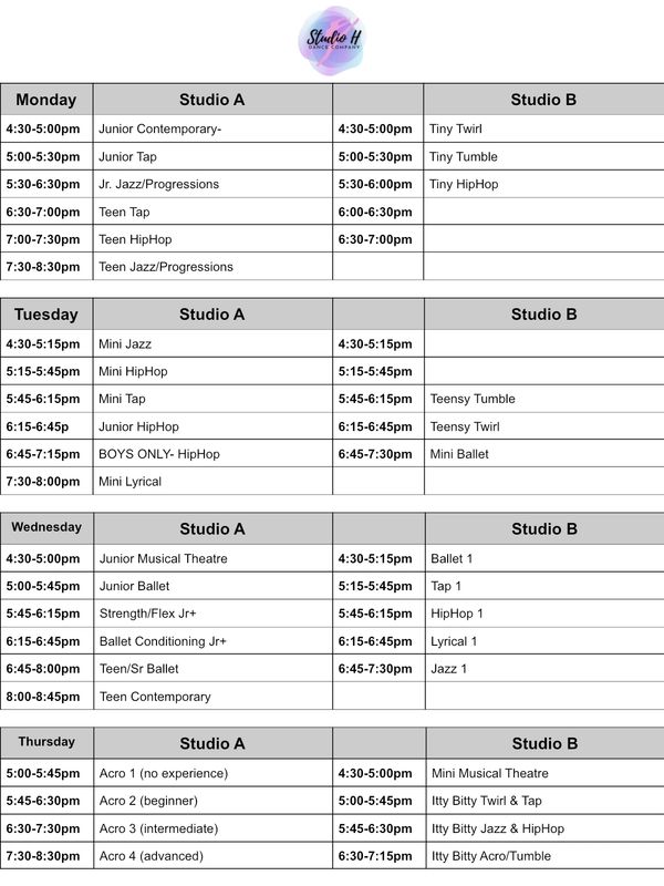 Studio H Dance Company offers a wide range of fun, challenging, and age-appropriate dance classes for students of all levels. Our weekly schedule includes Ballet, Jazz, Tap, Hip-Hop, Contemporary, Musical Theatre, and Acro, with specialized technique classes like Strength & Flex and Improv & Choreography. We also offer creative movement and early childhood classes such as Tiny, Itty Bitty, Mini, and Twirl for our youngest dancers starting at age 2. With classes divided by age and skill level—from Minis and Juniors to Teens—every dancer has the opportunity to grow in a positive and inspiring environment. Classes are held on Monday through Thursday.